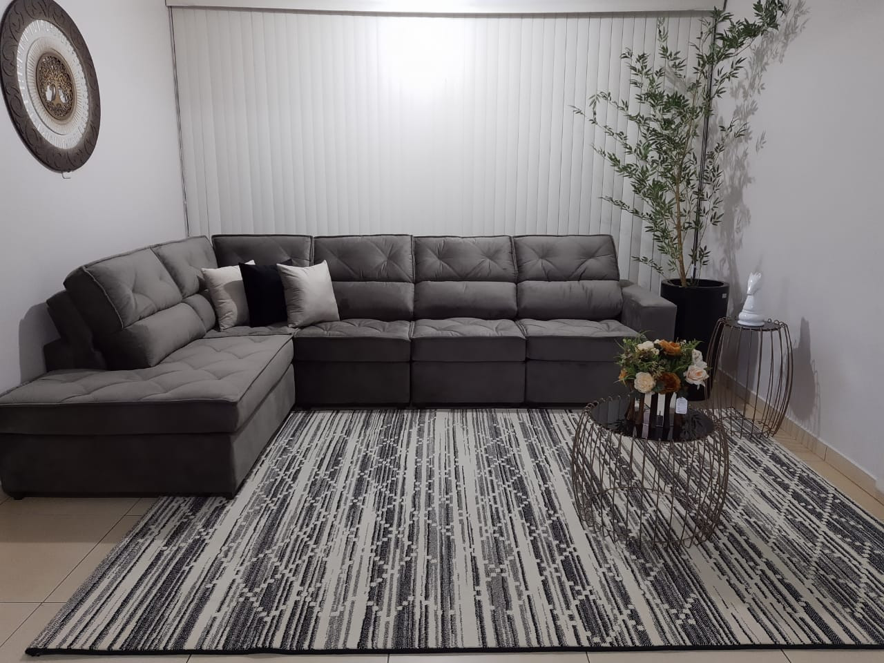 - Fixação:com grampos galvanizados antiferrugem;- Estrutura desenvolvida em madeira usinada ( reflorestamento );- Pés em madeira;- Estofado em formato L- Tecido/Cor ( cliente poderá definir pelo whatsapp (55)3332-8146 ); Medidas montado: